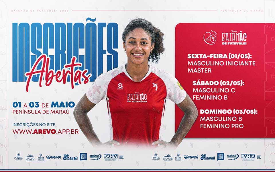 É na Península de Maraú que começa o Baianão de Futevôlei 2026, em um ano especial de celebração dos 20 anos da FAFEB. De 01 a 03 de maio, no Pontal Carapitangui, com uma estrutura preparada pra entregar uma experiência completa dentro e fora da quadra. Categorias confirmadas e inscrições abertas.